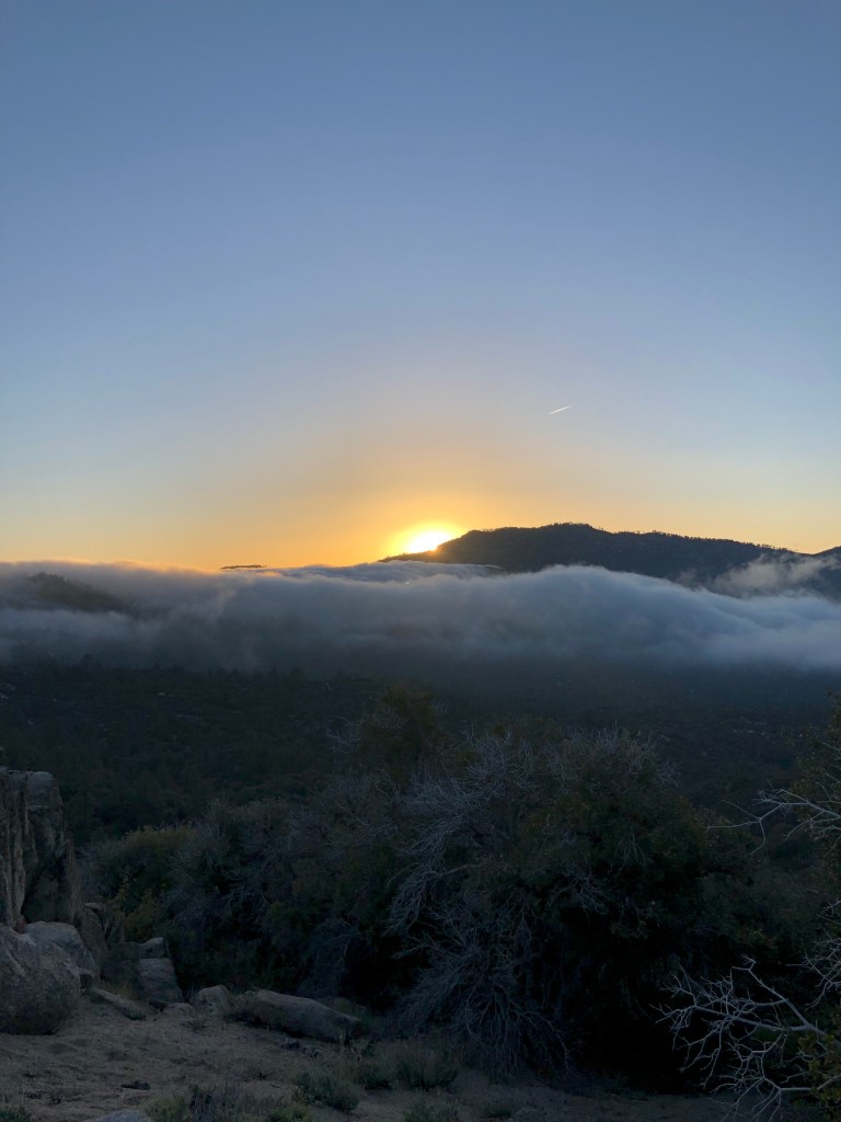 -Sunset from top of hill. Dust Off (Mary) and Stumbleweed (Octavia) at top. Clouds flowing over ridge, amazing.